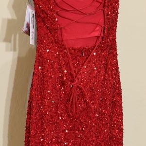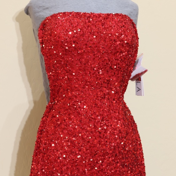 SCALA strapless sequin tie back short dress in red size 4. Boutique closeout sale these designer dresses tremendously marked down. Priced to sell. All sales are final.