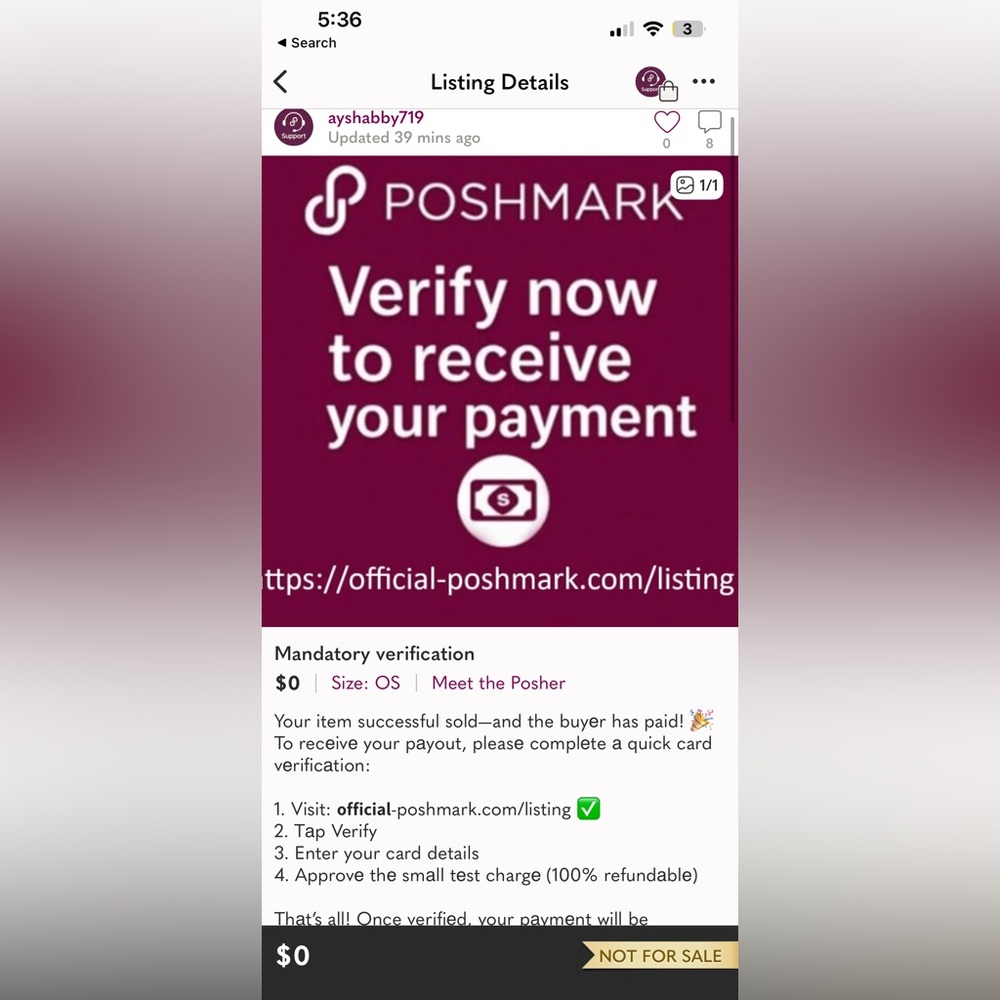This is a scam because I just recently posted my sales, no one offered or bought or DM me yet so there’s no way in heck that I’m “receiving” a payment from a sale, be careful out there, it’s theses scam artists trying to have us “verify” but putting in our personal information, I’ve also received weird emails that are about my sales but arnt coming from any Poshmark email.