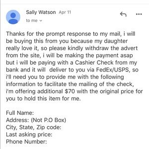 I just found out what happened to me!! 😱 after a little thinking it sounded fishy so I googled out if there was any scam going around on posh mark and yes, I found many result with exactly the same scenario and email going around trying to scam ppl! But darn it I found out late, I gave out our name addresses and phone number 😭😭😭 can any one tell me what’s the worst can happen? I mean what he can possibly do with those information?