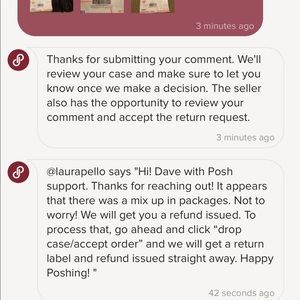 I kept asking her “if you’re someone named Michelle trying to help me, why are your comments coming from @laurapello telling me to cancel the case which is the only way to get a refund”. She just remained super nice and kept saying the same thing over and over. NOW USPS says that delivery is rescheduled because of a. Incomplete shipping address...that Poshmark sent for me to use!!! 🤔I’m so confused, a little annoyed bc I know I’m out the $ and really grossed out by what she sent😳🤢🤮