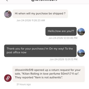 This person has purchase a perfume from me,then claimed the item was not authentic and used all the right words for Poshmark to then cancel the purchase without even returning the item to me…I have sent the receipt and everything else to customer service but still no help …