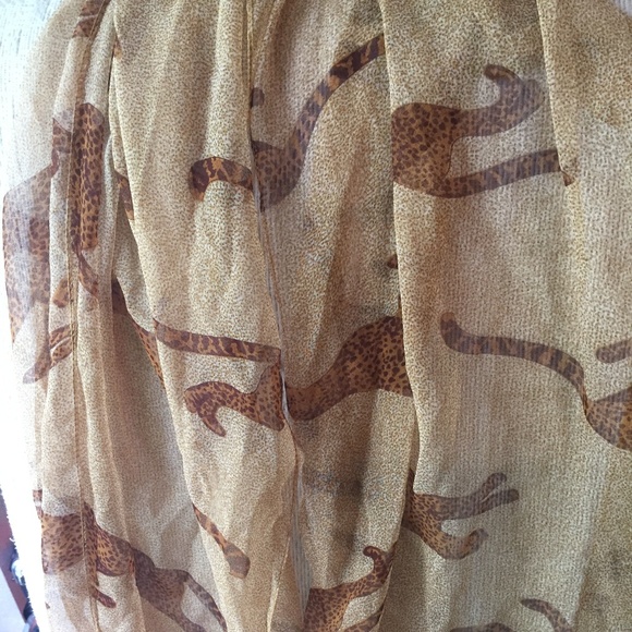 Remind them who's in charge with your daring cheetah print scarf. Wow! Sheer golden beige scarf with brown tiny dots that mimic the leopard's beautiful design. approx. 18" W x 60" L. Tiny bit of fraying on one corner- barely notice it- but reflected in lower price.