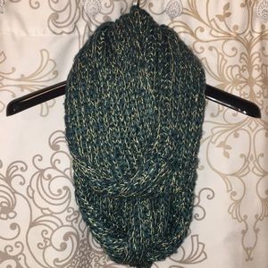 Teal & Gold knitted Infinity scarf. Shown many ways. Super warm and snuggly! Gorgeous colors. J Crew quality.