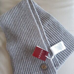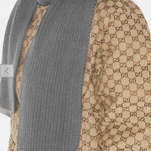 GUCCI , 85% WOOL 15% CASHMERE ; LIGHT GREY COLOR WITH LEATHER PATCH DETAIL , W 9.8" X L70.9"