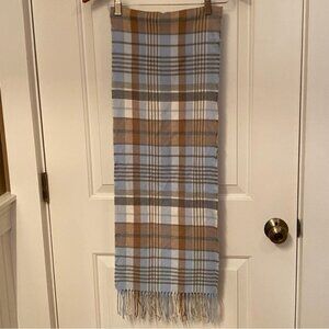 SCARF SCOTLAND CASHMERE SOFT BLUE WHITE BROWN GRAY PLAID FRINGE ACCESSORY