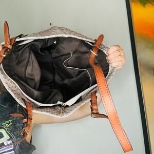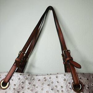 SCARLETON Rose Pink Synthetic Faux Ostritch Leather Brown Handles Zipper Bag. This SCARLETT bag offers a unique and stylish look. The rose pink faux ostrich leather adds a touch of texture and visual interest, while the brown handles provide a nice contrast. The zipper closure and potential interior pockets make it functional for everyday use.