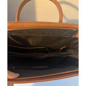 Interior: Dark fabric lining with center zip divider, additional interior zip pocket, and slip pockets