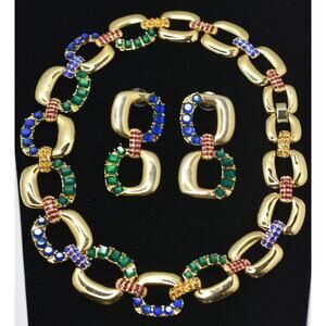 SCASSI Runway Haute Couture Rhinestone Gold Link Statement Necklace+Earring Set