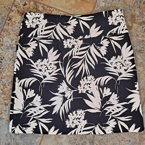Black and White print skort has leaves and a floral print. Elastic waist for easy pull on. Pockets on the front. Side slits for ease of movement. Small metal logo tag on the back.
