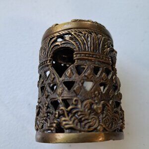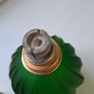 This exquisite fragrance lamp features a stunning frosted green glass body with a unique twisted design, exuding an elegant and sophisticated aesthetic. The ornate metal cap, crafted with intricate detailing, doubles as a diffuser, allowing for a subtle and continuous release of fragrance. The bottle itself is in good, pre-owned condition, with 2 areas of defects; last 2 photos shown with red pointer. The wick is un-used. The metal cap shows patina, consistent with its nature, which adds to its character and charm. This piece would make a beautiful addition to any vanity or collection, offering both functional use and decorative appeal.