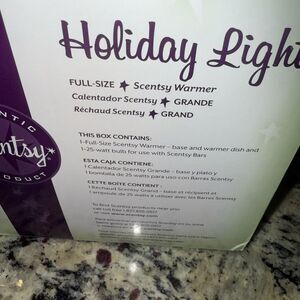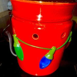 Bright red ceramic SCENTSY wax warmer with decorative green and blue lights. Perfect for adding a festive touch to any room.