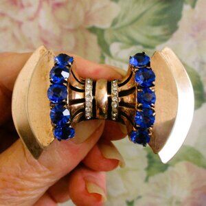 Stunning, Rare, and Unique, Vintage, Sterling Silver, Gold Vermeil (gold over sterling), Cobalt Blue Rhinestone, Retro Signed Bow Brooch, Signed "SCEPTRON"** by REINAD.