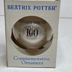 "1993 BEATRIX POTTER" - COMMEMORATIVE CHRISTMAS ORNAMENT! Made by SCHMID!! This Collectible Keepsake Ornament Commemorates 100 Years of Peter Rabbit 1893-1993. The Glass Ball Measures approx: 3 1/2" in diameter.