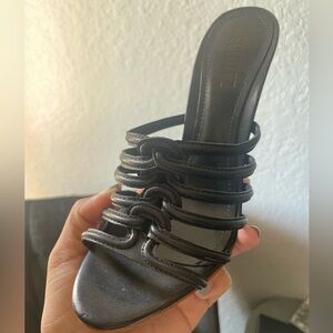 Stylish black wedge sandals. Strappy design. Perfect for any occasion.