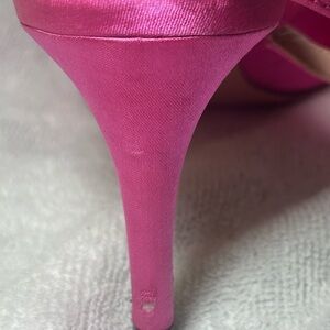 Chic fuchsia satin heels by SCHUTZ. Features a stylish black bow accent. Perfect for elegant outings.
