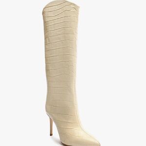 Elevate your style with SCHUTZ's cream heeled boots, featuring a sleek knee-high design and a sophisticated stiletto heel. Crafted from a textured material with a reptile-like embossed pattern, these boots offer a chic and versatile look. The pointed toe and seamless finish add a touch of elegance, making them a perfect addition to any wardrobe.