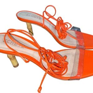Schutz, orange leather, bamboo heel, stiletto sandals, tie ankle, pointed toe, block heel, brazilian footwear, summer shoes, slip-on sandals, vibrant heels