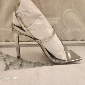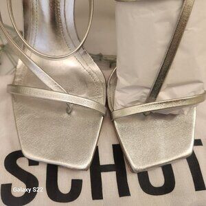 SCHUTZ "Heloise" Metallic Napa Leather Heeled Sandals. NIB. Size Various. Pics are of the 6.5, I have a size 9.5 and 7 in same box/condition. No rips/scuffs/tears/peeling. NIB/Original box/packaging. With dust bag. Some sticker residue on the base of one shoe, see final picture (not rips/or tears). Smoke free home. No odors. All offers are welcome. Thank you! Have two pair, one has the dust bag, one does not. Please let me know if you prefer the dust bag.
