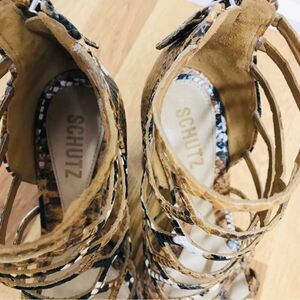 SCHUTZ Juliana Leather Caged Block Heel Sandal Snake Embossed Tan Black Size 7.5