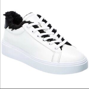 Features a white leather lace up sneaker with faux shearling black lining and small platform.