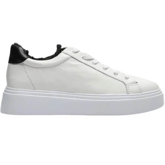 Features a white leather lace up sneaker with faux shearling black lining and small platform.