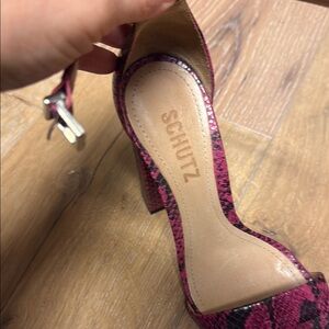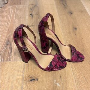 These SCHUTZ pink heels feature a striking snakeskin pattern, offering a luxurious and eye-catching texture. The slim ankle strap with a buckle ensures a secure fit, while the high slender heel adds a touch of elegance to any ensemble.