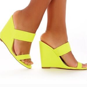 These vibrant neon yellow wedge sandals feature a sleek open toe design and a high wedge heel for added height. The shoes are designed with two straps across the front, providing a modern and stylish look.