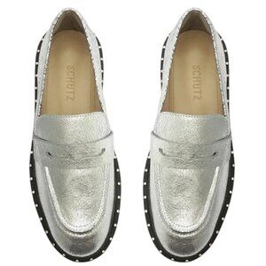 schutz loafers, schutz christie loafers, schutz x free people, silver platform loafers, metallic loafers, chunky loafers, penny strap loafers, studded loafers, glam loafers, women’s size 6.5 loafers, schutz shoes, free people loafers, platform flats, statement loafers, christie stud loafers, designer loafers, trendy loafers, edgy loafers, schutz metallic shoes, women’s loafers