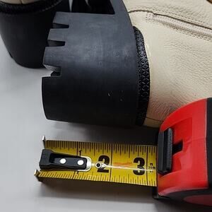 HELLO ,THESE AWESOME SCHUTZ STYLE ☆ XAYENE ANKLE BOOTIES COLORWAY IS EGGSHELLS CREAMY UPPERS AND BLACK BOLD BOTTOMS.THE HEEL MEASUREMENTS ARE IN THE PICTURES. THE BIG HEEL IS RUBBER FOR BETTER GRIP.