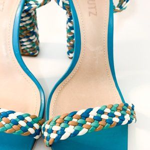 SCHUTZ blue braided block heel square toe sandal ankle wrap 38