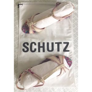 Tropical paradise! Such a fun, bold print on these sandals. Perfect for vacation and festival season. These unfortunately are about a size too small for my Sasquatch foot and didn't return/exchange them in time. By Brazilian brand, Schutz. They're new in box and come with a dust bag (see last photo). Size 9 USA/ 40 EUR. Feel free to ask any questions. πβπ»οΈπ