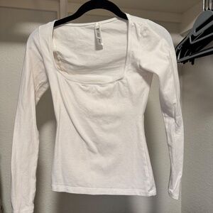 Classic white long-sleeve top with a wide square neckline. Fitted, stretchy, and super flattering. Minimalist design that works for casual outfits, layering, or going out.
