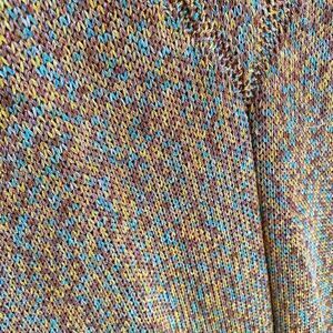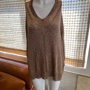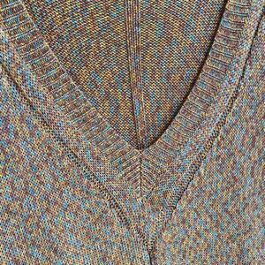 SCOOP NYC multicolor V-neck long sweater in size large. Professionally dry cleaned prior to listing. Primarily gold and reddish tones. 93% polyester and 7% viscose. Super flattering and comfortable