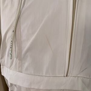 SCOTCH AND SODA jacket in a cream and tan polyester blend fabric featuring a color block design, hooded style, drawstring waistband, and half zip closure.