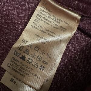 The SCOTCH & SODA Button Down Shirt in Men's size small features a stylish geometric pattern in a dusty mauve color, making it perfect for casual occasions or the office. Made from comfortable cotton knit fabric, this shirt has a classic button-up style with a collared neckline and long sleeves. The regular fit and breathable material ensure a comfortable and versatile option for all seasons. Perfect for the man who values a preppy yet modern look with accents of city style.