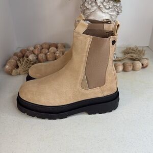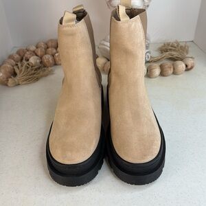 platform style, lug sole and heel, pull on tabs, goring for stretch, size chart conversion may vary slightly by country 2.25in. heel mid calf boots 6in. shaft height, 10in. shaft circumference, taken from size 40 rounded toe, pull on suede upper imported, made in Portugal. Size 7.5