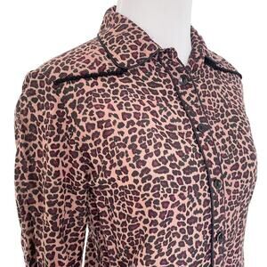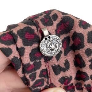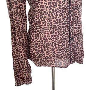 Tissue-thin, button-front top in a unique leopard print (black and burgundy spots again a pinkish-tan background) with tiny pom-pom accents on the shoulders. Pewter-tone brand charm attached to side.