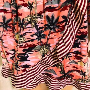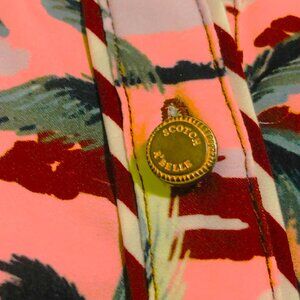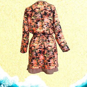 SCOTCH & SODA vibrant tropical inspired piece featuring a lively palm tree print against a sunset background of coral pink, peach, and soft blush tones with accents of dark brown and black. Long sleeves, round collar with a short front button placket and elasticized waistband for a comfortable, slightly cinched silhouette that flatters the figure. The dress also features a wrap style skirt with ruffled hemline edged in a contrasting diagonal stripe print in a red and white pattern adding a whimsical, modern twist . Excellent condition, like NEW, never worn. Polyester fabric, delicate machine wash. Bust 34 Inch, Skirt Length 17 Inch. Size XS - S