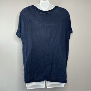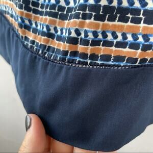 Short sleeved blouse with navy blue, orange, and white abstract design on front with navy blue trim. Cute little crochet design between front panel and blue hemline. Breathable and comfy with the linen back and sleeves.