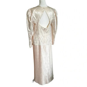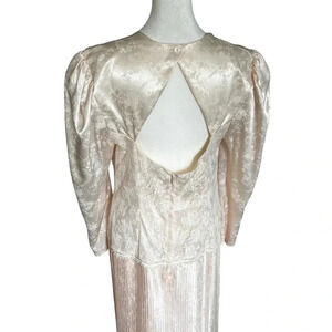 For the one who dreams in rose-colored hues 🌸✨ This late 1980s / early 1990s blush pink brocade gown feels like it was made for a storybook ballroom. The shimmering satin brocade catches the light like spun sugar, while the lace overlay on the sweetheart bodice brings soft romance. A dramatic pleated skirt flows with regal grace, balanced by a delicate drop waist that elongates the silhouette. The surprise cut-out back whispers a touch of intrigue, keeping it equal parts sweet and daring.