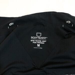Versatile and technology-enabled garment perfect for travel. Made from polyester with a solid black color, this mid-length vest features a zip, button, and snap closure for convenience. Designed for outdoor use during the winter, fall, and spring seasons, it also incorporates RFID technology for added security while on the go. The classic style of this vest makes it a practical and stylish choice for women looking for a functional outerwear option.