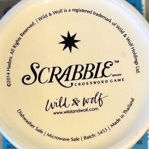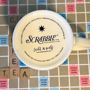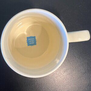 The perfect mug for Scrabble crossword board game or word game enthusiasts! Cream colored ceramic mug features a black “T1” on one side, and the full Scrabble letter distribution chart on the other. Surprise detail is a blue Double Letter Score square inside the mug! By Wild & Wolf. Dishwasher and microwave safe. Measures 3.75” tall with a 3.25” diameter; 5” across including handle. Holds 12 fluid oz. Made in Thailand. (Scrabble board and tiles not included.)