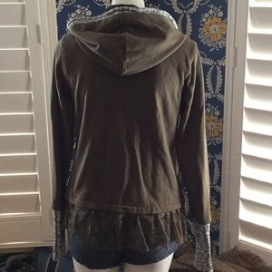 Women’s size medium hoodie. Army green color with army green lace along bottom hem. Sleeves have grey woven as the cuffs. Also has grey woven along the lining of jacket. Inside material is floral. Very unique!!!!
