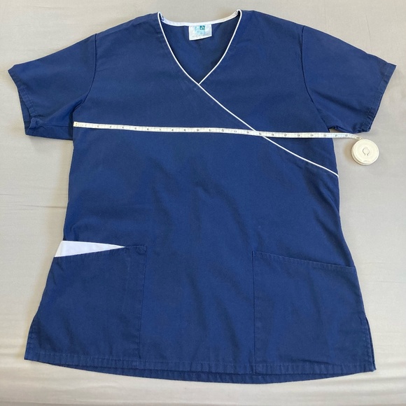 Lightly used navy blue scrub top with white accent. White tie in back. See measurements. Do have pants that go with this