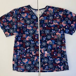 PEACHES UNIFORM PATRIOTIC SCRUB TOP. GENTLY USED FROM CAT FRIENDLY HOME.