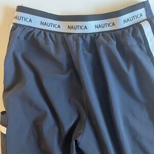 Elastic waistband with drawstring with metal ends, dark gray with black and white features, 4 open pockets, elastic at ankles for jogger style, nautica branding along back of waistline