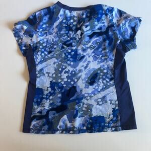 Top: brand: Marvella by white cross, colors: whites, blues and greys, 2 navy stripes down side make it slimming, v neck, 2 open pockets