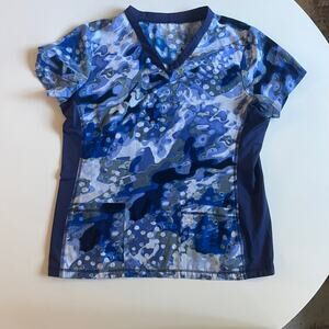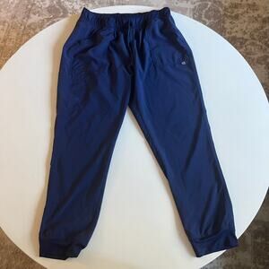 Pants: scrubstar brand, navy blue, elastic drawstring waistband, 2 open pockets, 1 snap close pocket, tighter at ankles, jogger style