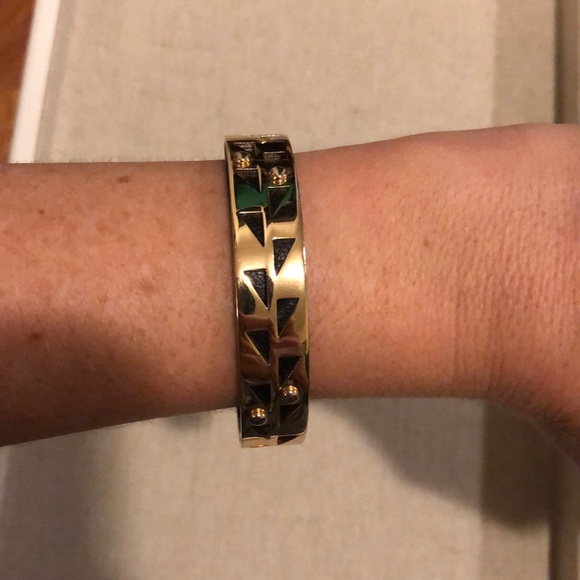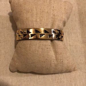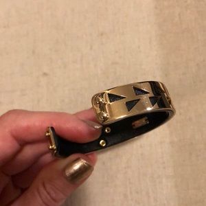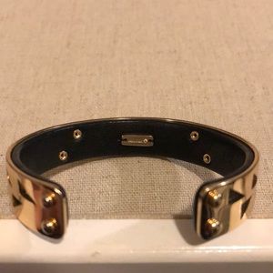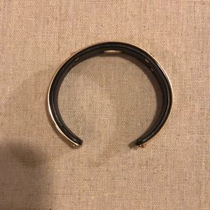 Genuine black leather and gold plated cuff. EUC. Extremely mild surface scratching from wear. Fits Sm-Lg wrists and is flexible to fit. Comes with box. Super cute alone or in a stack.