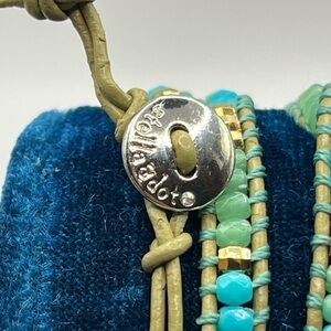 S&D Wanderlust Triple Wrap Bracelet Blue and Green Beads Tan leather Cord 22